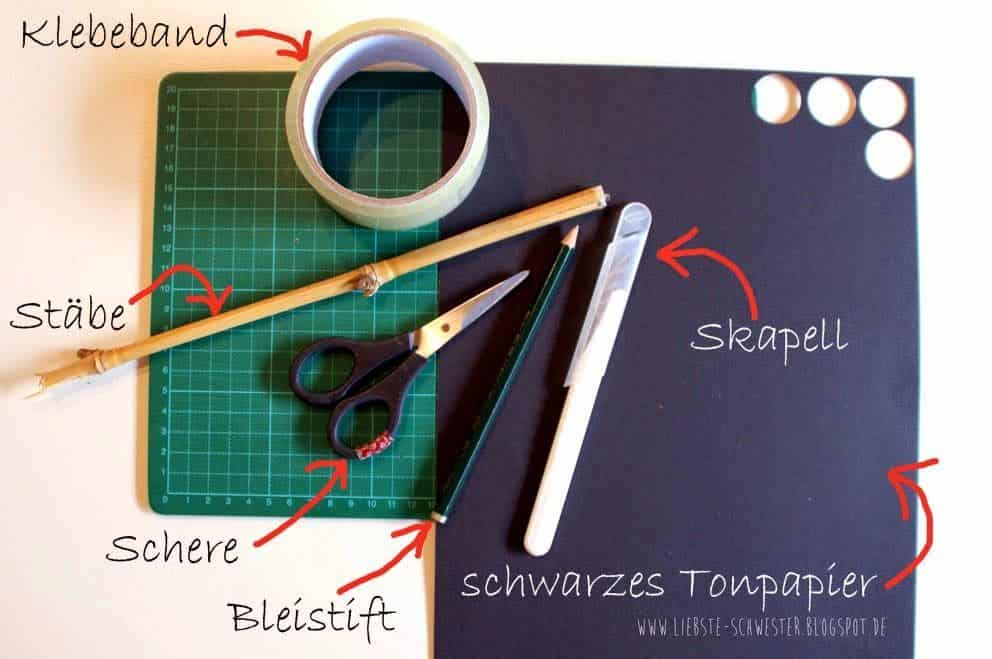 Für jeden Darsteller im Buch braucht ihr schwarzen großes Tonpapier, pro Tier einen Stab (kann ein einfacher Stab aus dem Wald sein). (Jedes Tier sollte im fertigen Zustand eine Größe von mind. A3 haben). Dazu Klebeband, eine Schere, einen Bleistift, ein Skalpell und es empfiehlt sich eine schneidfeste Unterlage zu benutzen.