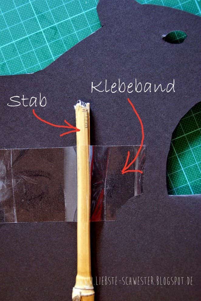 Die Figuren werden auf der Rückseite mit breiten Klebeband auf einen Stab oder Stock, dabei reicht ein einfacher Stock aus dem Wald, festgekleben. Der Stab sollte eine Länge von ca. 60cm haben, damit ihr ihn gut verwenden könnt.