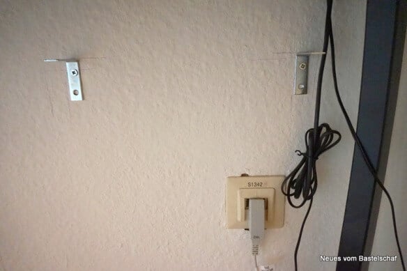 Den Karton dafür an die Wand halten, dort wo er später hin soll. Mit einem Bleistift die oberen Ecken auf der Wand umranden. Ein paar Zentimeter von diesen Ecken nach innen gerückt die Winkel anbohren, bündig mit der oberen Kante. Eine Schraube pro Winkel reicht.