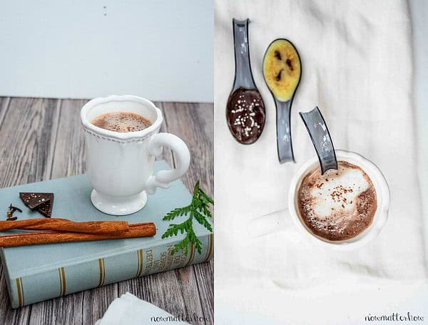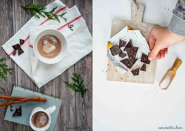 Ich habe für die heißen Schokoladen Mandelmilch und ein bisschen Almond Butter verwendet, man kann sie aber auch prima mit ganz normaler Milch oder zur Hälfte Milch und zur anderen Sahne machen.