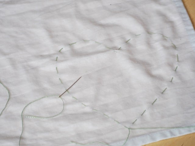 Mit einem einfachen Heftstich nähst du entlang der Motivlinie. Ziehe danach beide Fadenenden fest zusammen und verknote diese. Die Raffung sollte wirklich sehr straff sein.