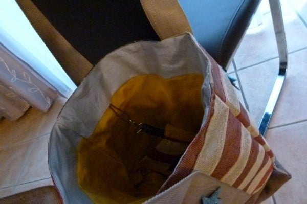 Außen habe ich einen Leinenstoff genommen. Der Boden ist aus Lammfellleder, den ich aus dem Ärmel eines alten Ledermantels gewonnen habe. Innen ist Curryfarbener Baumwollstoff und der Rand oben aus silberfarbenen Stoff, den man für Regenschirme nehmen kann.. Gebraucht habe ich 4,5 Stunden und es ist meine erste Tasche!