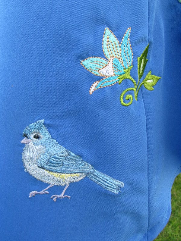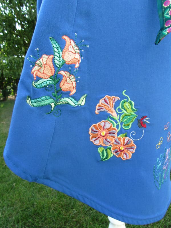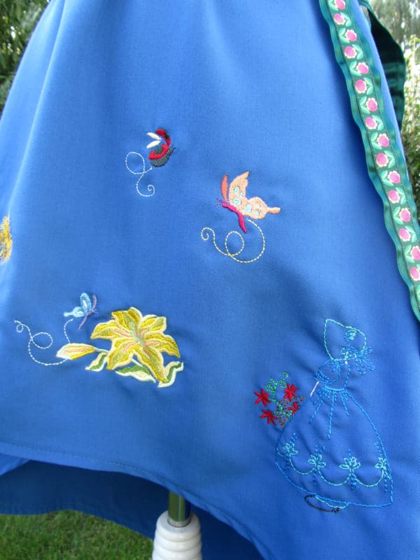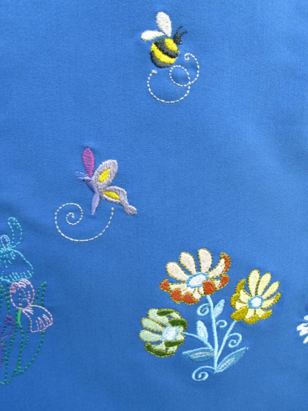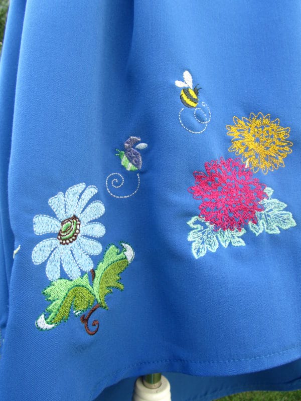 Habe einen sehr schönen blauen Stoff gefunden und eine kleine Blumenwiese darauf gestickt.