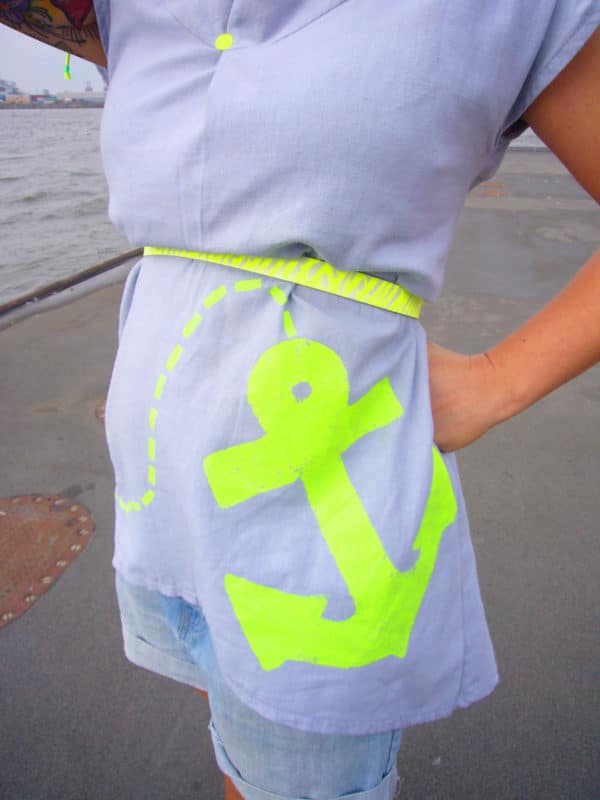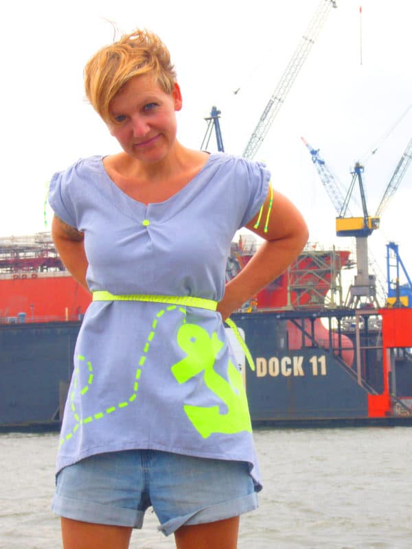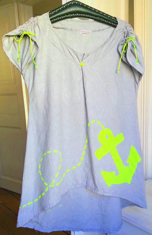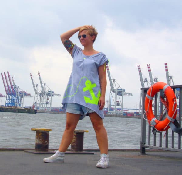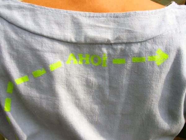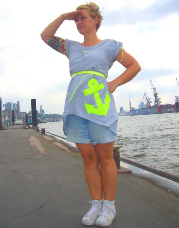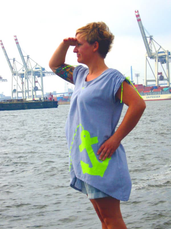 Es fing an, mit einer Leinen-Gardine in weiss. Denn nur eine Gardine hatte eine Länge von 2,50 m! (Ich wollte unbedingt Material nehmen, dass ich noch zu Hause hatte) Der Zuschnitt und das nähen klappte sehr gut und als das Kleid fertig war habe ich es kurzerhand grau gefärbt inkl. der Neonbänder, denn die lassen sich eh nicht färben. Dann kam die nächste Herausforderung! Ein Stempel musste her … Anker, Strichellinie und „Ahoi“ habe ich aus Moosgummi geschnitten und dann mit Neonfarbe aufs Kleid gestempelt. Den Halsausschnitt habe ich mit einer kleinen Falte abgeändert und auch der Knopf ist handmade … nämlich aus Schrumpffolie und Neonfarbe. Et Voilà!