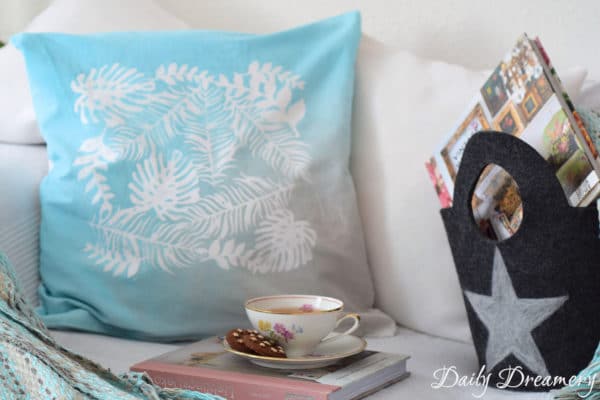 Den Sommer nach Hause holen und das Sofa mit neuen Kissen aufpeppen: ganz easy Kissenhüllen mit Textilspray und Schablone verzieren.