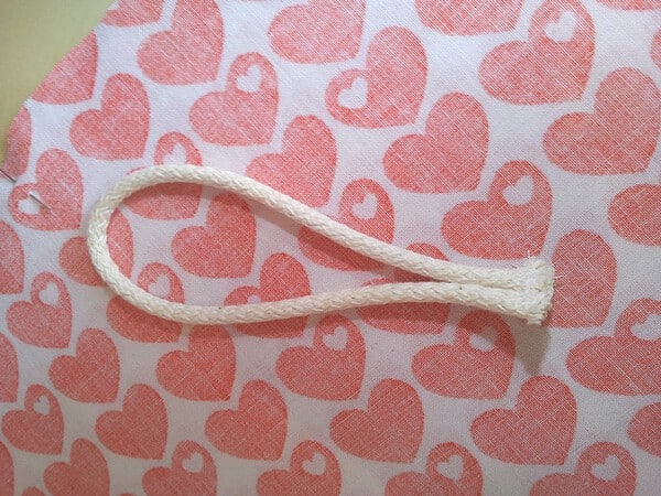 6. Lege die Seitenteile rechts auf rechts und fixiere sie mit ein paar Stecknadeln. Lege am Scheitelpunkt der Zuschnitte die Baumwollkordel mit der Schlaufe nach innen zwischen die beiden Seitenteile und fixiere sie ebenfalls mit einer Stecknadel. Das Ende der Kordel ca. 1 cm herausstehen lassen.