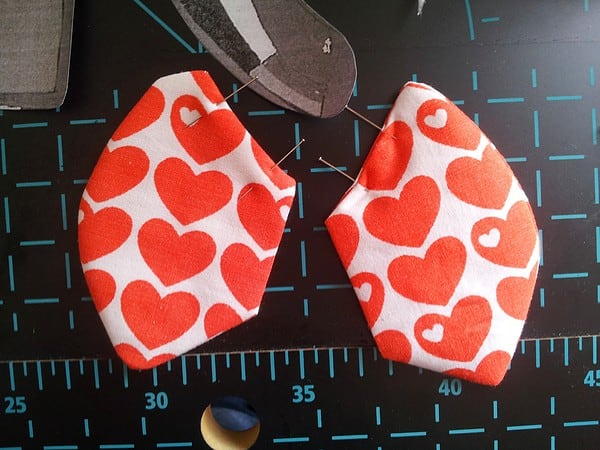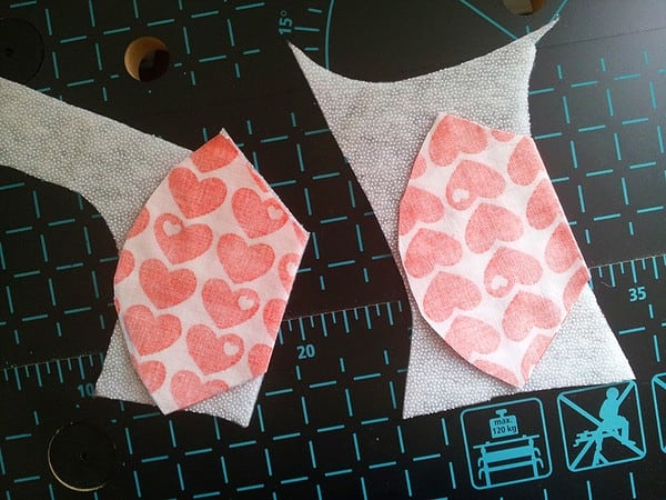 3. Bei Elmar habe ich auch die Ohren im Stoffbruch (Ohrenvorderseite) inklusive Nahtzugabe von 0,7 cm zugeschnitten und auf die linken Ohrenseiten Volumenvlies H630 gebügelt, um die Ohren plastischer erscheinen zu lassen. Sodann habe ich die Ohren rechts auf rechts mit einem Geradstich abgesteppt, jeweils am Anfang und am Ende verriegelt und eine Wendeöffnung von ca. 4 cm gelassen. Ohren gewendet, gebügelt und die Öffnung verschlossen sowie die weiteren Seiten knappkantig mit 3 mm Abstand zur Stoffkante abgesteppt und verriegelt.