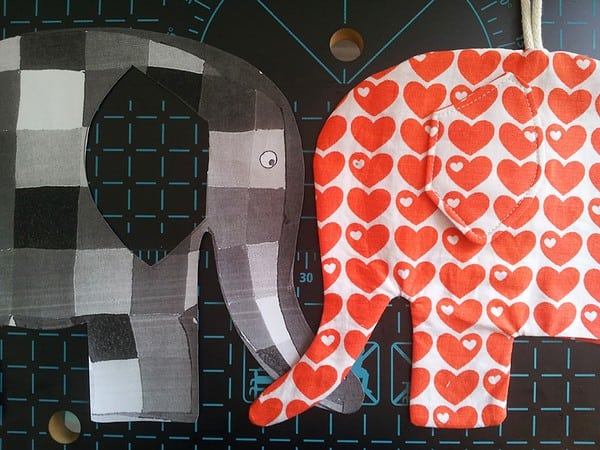 Als Vorlage habe ich Elmar, den buntkarierten Elefanten, von David McKee gewählt und auf die gewünschte Größe hockopiert. Im Anschluß habe ich den Schnitt etwas modifiziert, indem ich Ecken abgerundet und Linien begradigt habe.