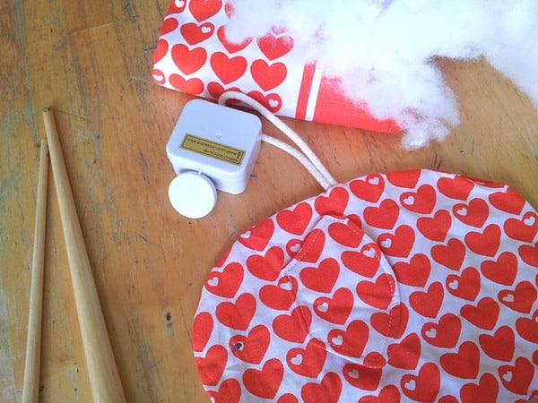 6. Die Hülle nun mit Füllwatte ausstopfen, wenn nötig, wieder ein Stäbchen oder einen Pinsel benutzen, um schwierige Stellen zu füllen. Wenn die Hülle prall gefüllt ist und sich die Füllwatte wie gewünscht verteilt, drücke über die wendeöffnung mittig eine Mulde in die Füllung und setze das Spielwerk ein. Das Ende des Zugbands bleibt außerhalb der Füllung.