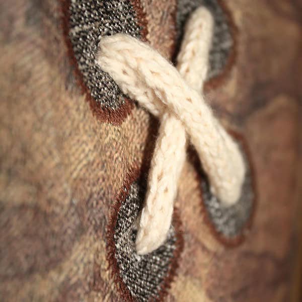 Das „Nähgarn“ von dem Knopf ist ein kleines Stück gestricklieselte Wolle, die einfach durch die Knopflöcher gezogen wird.