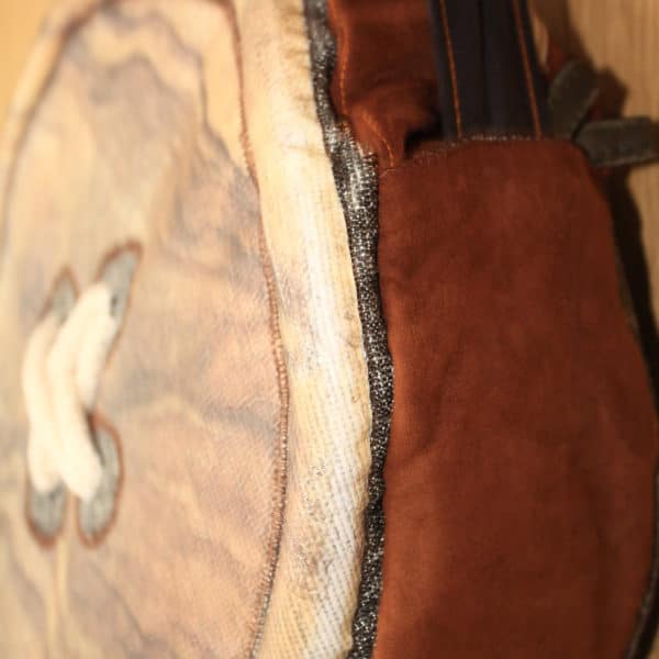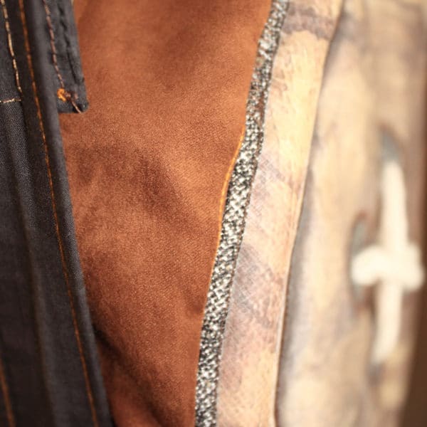 Stoffe: grau melierter fester Stoff, braunes Kunstlederimitat.