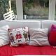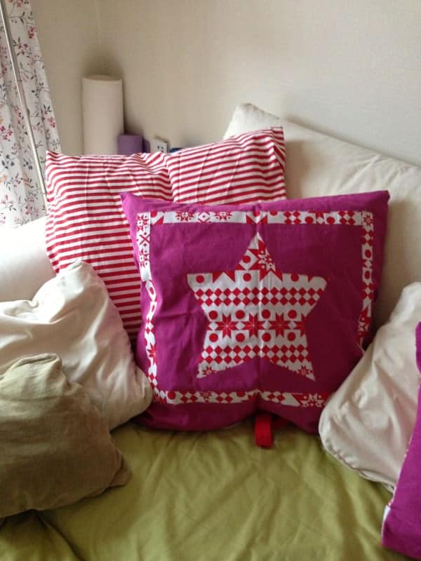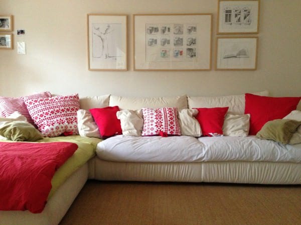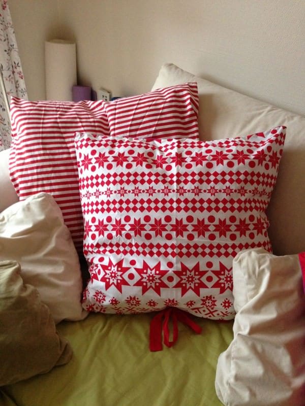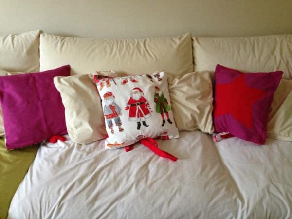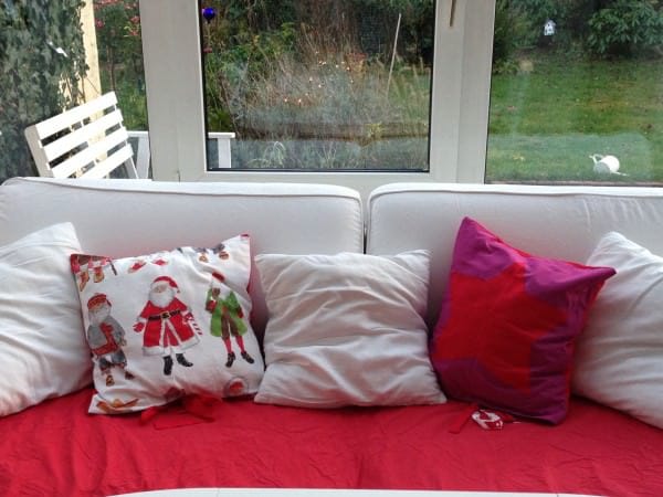 Ich habe mich im großen schwedischen Einrichtungshaus in der Kissen- und in der Stoffabteilung mit strapazierfähigen Baumwollstoffen und Baumwollkissen in verschiedenen Größen eingedeckt und einfach passende Bezüge genäht. Unten zwei Bänder dran, die zu einer Schleife gebunden werden, und ruckizucki ist das Wohnzimmer weihnachtlich.