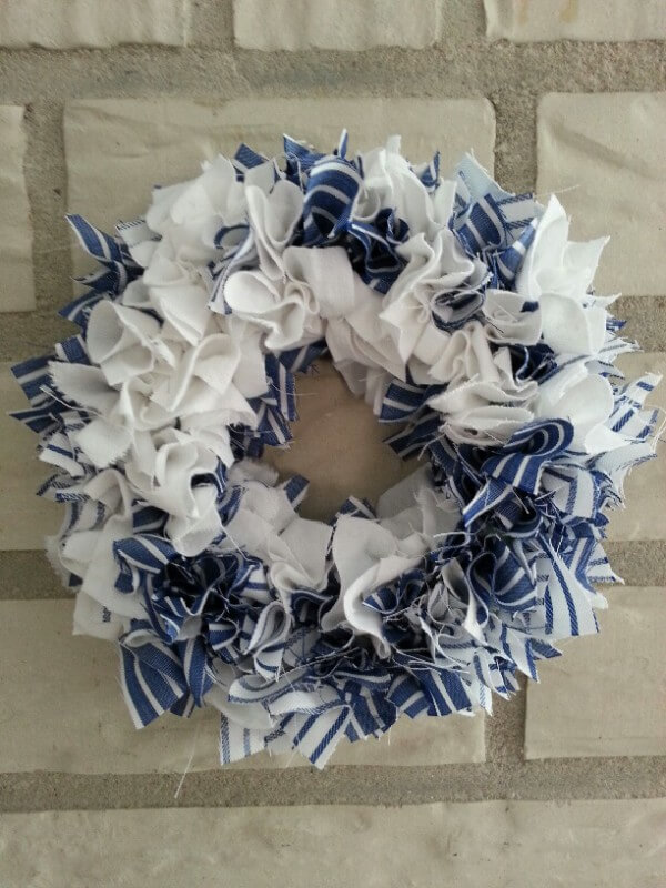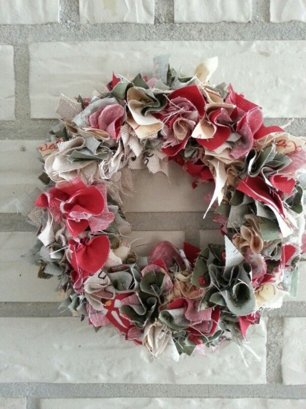 Stoffreste kann man gut zu einem Restekranz verarbeiten. Wer ihn nicht aufhängen möchte, kann ihn auch flach auf eine Kommode oder Tisch legen und ein Glaswindlicht in die Mitte stellen.