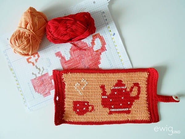 Ich würde eine Maschenprobe bzw. ein kleines Teststück zu Beginn empfehlen, gerade wenn ihr noch nie tapestry crochet probiert habt. Hier wird nämlich wesentlich fester und auch am Besten mit einer Nadelstärke kleiner als gewohnt gehäkelt. Ich hab mich bei meinem Kannenwärmer ganz klassisch für das Motiv "Kanne und Tasse" entschieden, ihr könnt euch natürlich auch ein anderes Motiv wählen ...