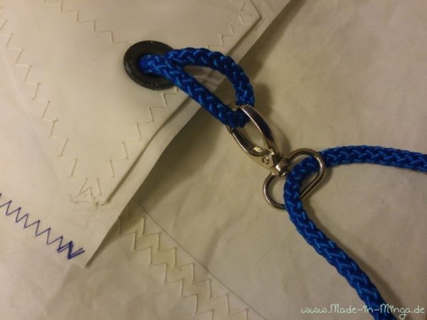 Mein altes Segel hatte schon Ösen. Davon wollte ich Gebrauch machen und habe sie als Gegenstück für den Verschluß verwendet