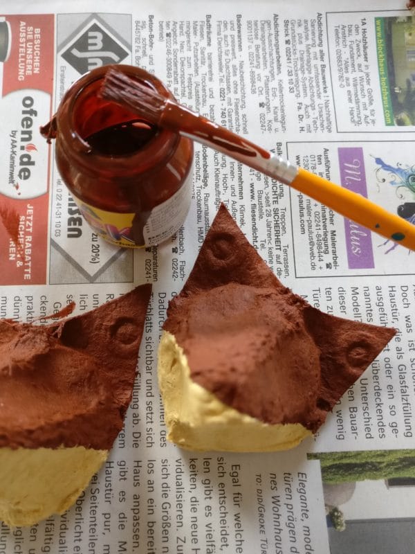 Zunächst aus dem Eierkarton die „Türmchen“ mit jeweils zwei Böden herausschneiden. Dies ist die Grundform für die einzelnen Tierköpfe (inkl. Ohren). Soll beispielsweise ein Fuchs gestaltet werden, so schneidet man die Bodenlaschen zu Dreiecken, bei einer Maus bleiben sie rund.