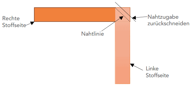 Randstreifen entlang der Falte vom Nahtende nach außen zusammennähen. Überschüssigen Stoff mit 1,25 cm Nahtzugabe zurückschneiden. Naht auseinander bügeln.