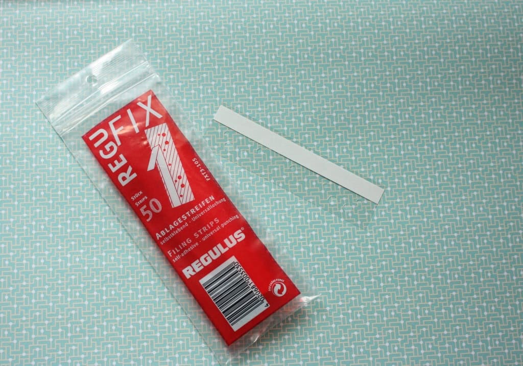 Selbstklebende Heftstreifen aus dem Bürobedarf können mittig an den Beutel geklebt werden. Für mehr Festigkeit können auch zwei Streifen von je einer Seite angeklebt werden.