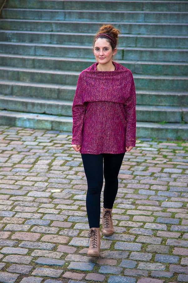 Außerdem kann man das Kleid sowohl in lang, als auch in kurz tragen. Da der Stoff sehr dehnbar ist, kann man ihn einfach in Brusthöhe zu einer Falte einschlagen und hat so ganz schnell aus dem langen Kleid ein Kurzkleid bzw. einen Pullover gemacht. Diese Variante ist auch alltagstauglich, d.h. die Falte löst sich nicht von alleine wieder auf, sondern bleibt in Position, auch wenn man sich bewegt oder spazieren geht.