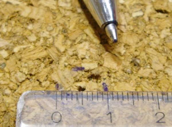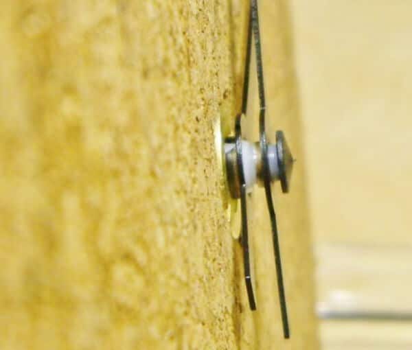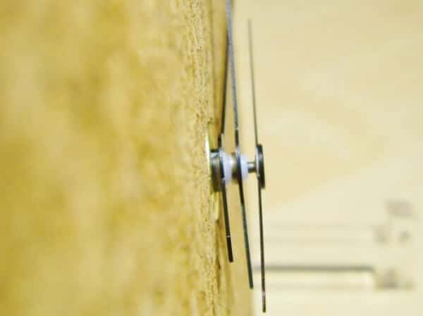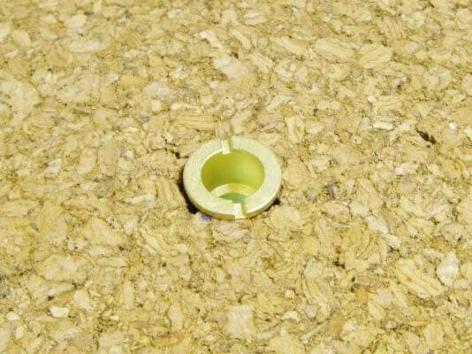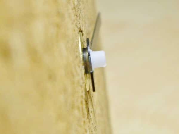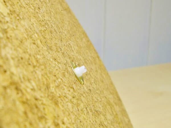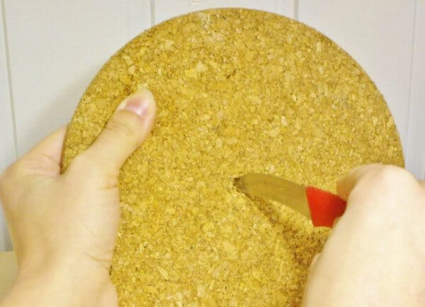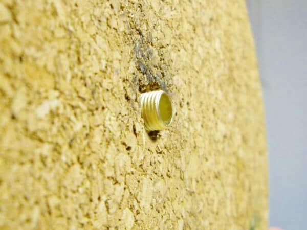 - Mit Hilfe eines Zirkels die genaue Mitte der Korkplatte bestimmen. Anschließend den Außendurchmesser der Zentralschraube oberhalb des Gewindes ausmessen und dementsprechend eine Lochvorlage auf der Korkplatte skizzieren. Die Zentralschraube wird später (bis auf der obere Rand) durch die Platte geschoben.