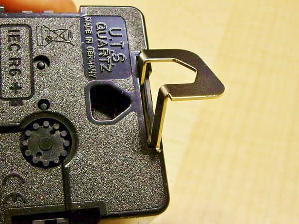 - Nun den Anhänger an dem Uhrwerk montieren. Dafür einen Schenkel in den vorgesehen Schlitz schieben und den anderen Schenkel des Aufhängers durch Zusammendrücken ebenfalls in den Schlitz schieben.