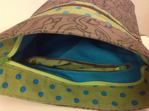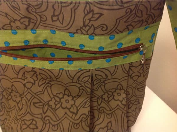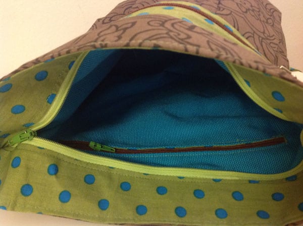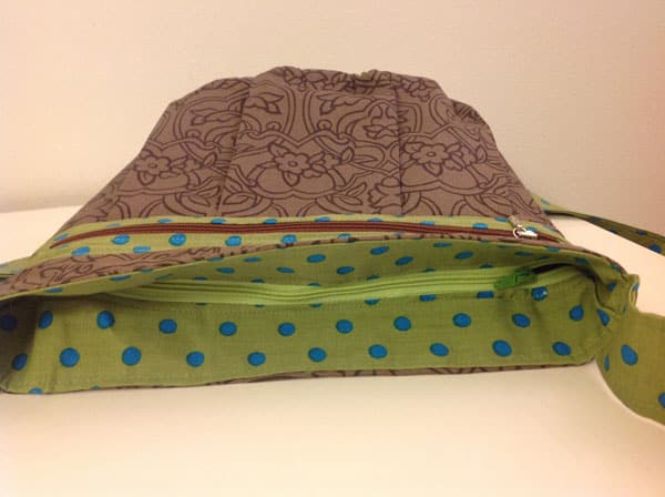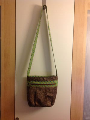 Trotz super toller Fotoanleitung von war es für mich nicht ganz so easy. Aber wie man sieht hat sich die Mühe total gelohnt! Die süße Alltagstasche misst zwar nur 26x28cm, bietet aber durch den ovalen Boden ziemlich viel Stauraum. Sie hat viele Fächer, sowohl ein Großes außen und ein Kleines innen. Die Tasche ist mit einem Zippverschluss zu schließen.Leider kommen die Farben der Stoffe auf den Fotos nicht so gut rüber. Es handelt sich um ein edles Braun und Apfelgrün mit türkisen Punkten.
