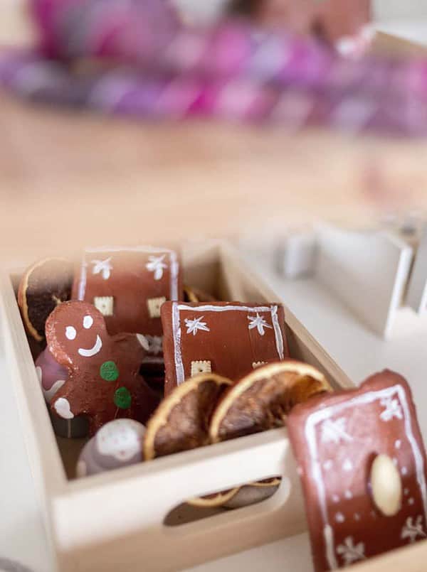 Unseren Kaufladen haben wir in einen kleinen Weihnachtsmarktstand verwandelt. So verbringen wir die Zeit mit dem Warten auf das Weihnachtsfest mit Lichterglanz, Tannenduft und leckeren Süßigkeiten. Dazu haben wir Lebkuchen, Liebesäpfel, Zuckerstangen und kleine Plätzchen gemacht. Schöner selbstgebastelter Tannenbaumschmuck wird in unserem Kaufladen ebenfalls sehr gerne verkauft. Also los geht’s – machen wir uns die Vorweihnachtszeit wunderbar!