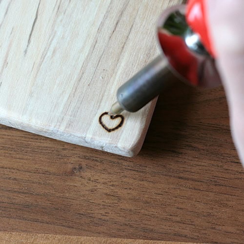 Nun einfach entlang der aufgezeichneten Linie die beiden Untersetzer aus dem Frühstücksbrettchen aussägen. Ich habe hier eine elektrische Säge verwendet, aber mit etwas Gedult, geht es sicher auch mit einer Laubsäge.