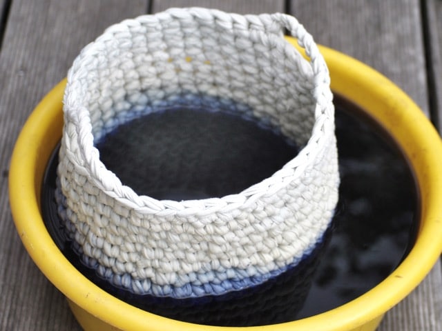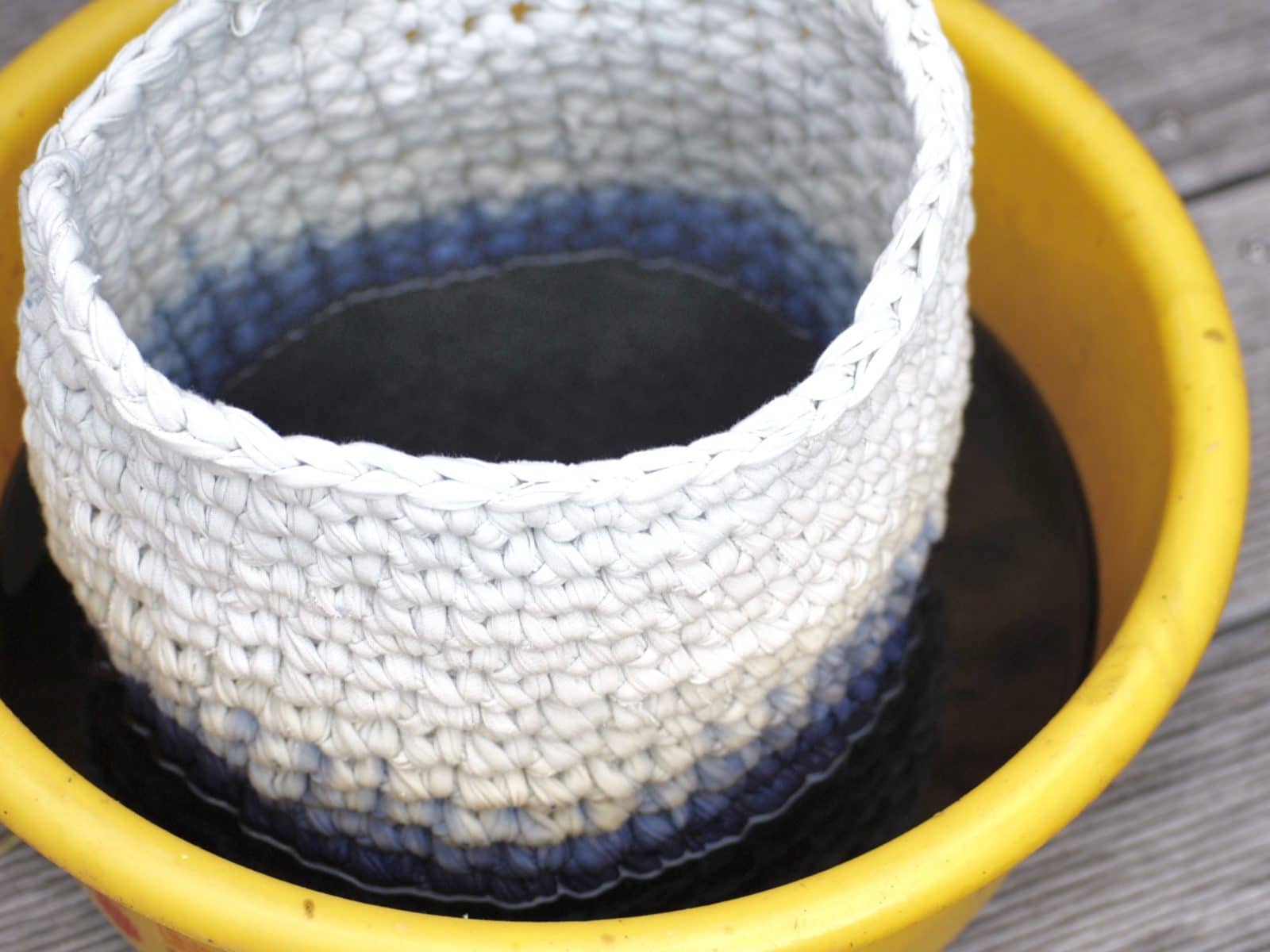 Der fertige Häkelkorb wird nun im Shibori Dipdye Verfahren gefärbt.