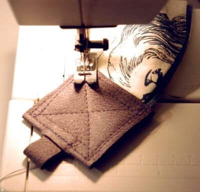 - der Stofftunnel mittig auf dem Lederrechteck fixiert, sowohl von oben als auch von unten