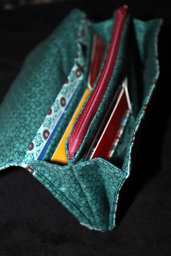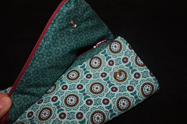 Meine kreative Veränderung ist ein Reißverschluss im „Deckel“ des Portemonnaie. Hier können kleine Fotos von Freunden und Einkaufschips gut aufbewahrt werden. :) Außerdem habe ich 8 anstatt nur 4 Kartenfächer eingenäht.