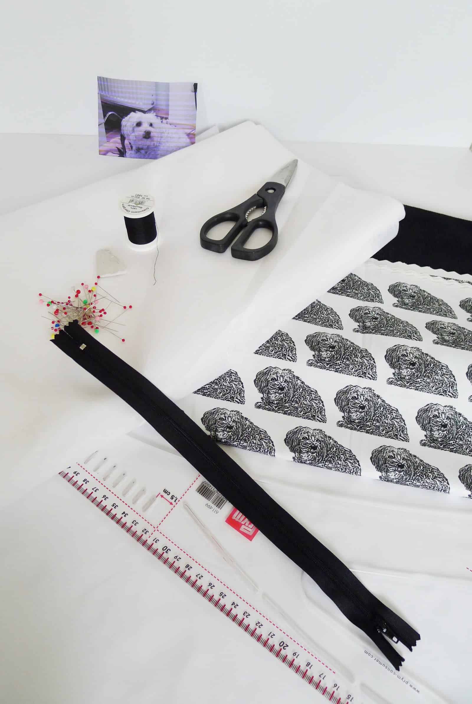 Nach ca. vier Wochen ist der Stoff fertig gedruckt. Alles nächstes kommt die Auswahl der Arbeitsutensilien und des zusätzlichen Materials wie Bügelvlies, Reißverschluss und hier noch zwei Streifen schwarzer Cordstoff an die Reihe.