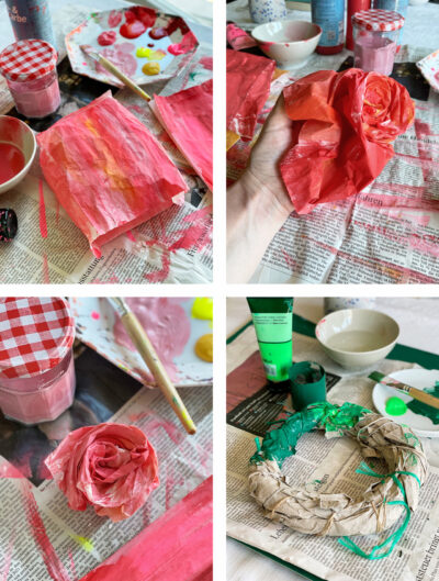 Dieser Rosenkranz entsteht aus Butterbrottüten und Altpapier. Materialien, die normalerweise im Alltag verschwinden, bekommen hier eine neue Form und einen festen Platz, z. B. an der Wohnungstür, sehr zur Freude der Nachbarn!