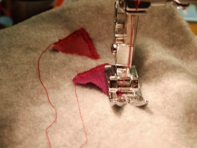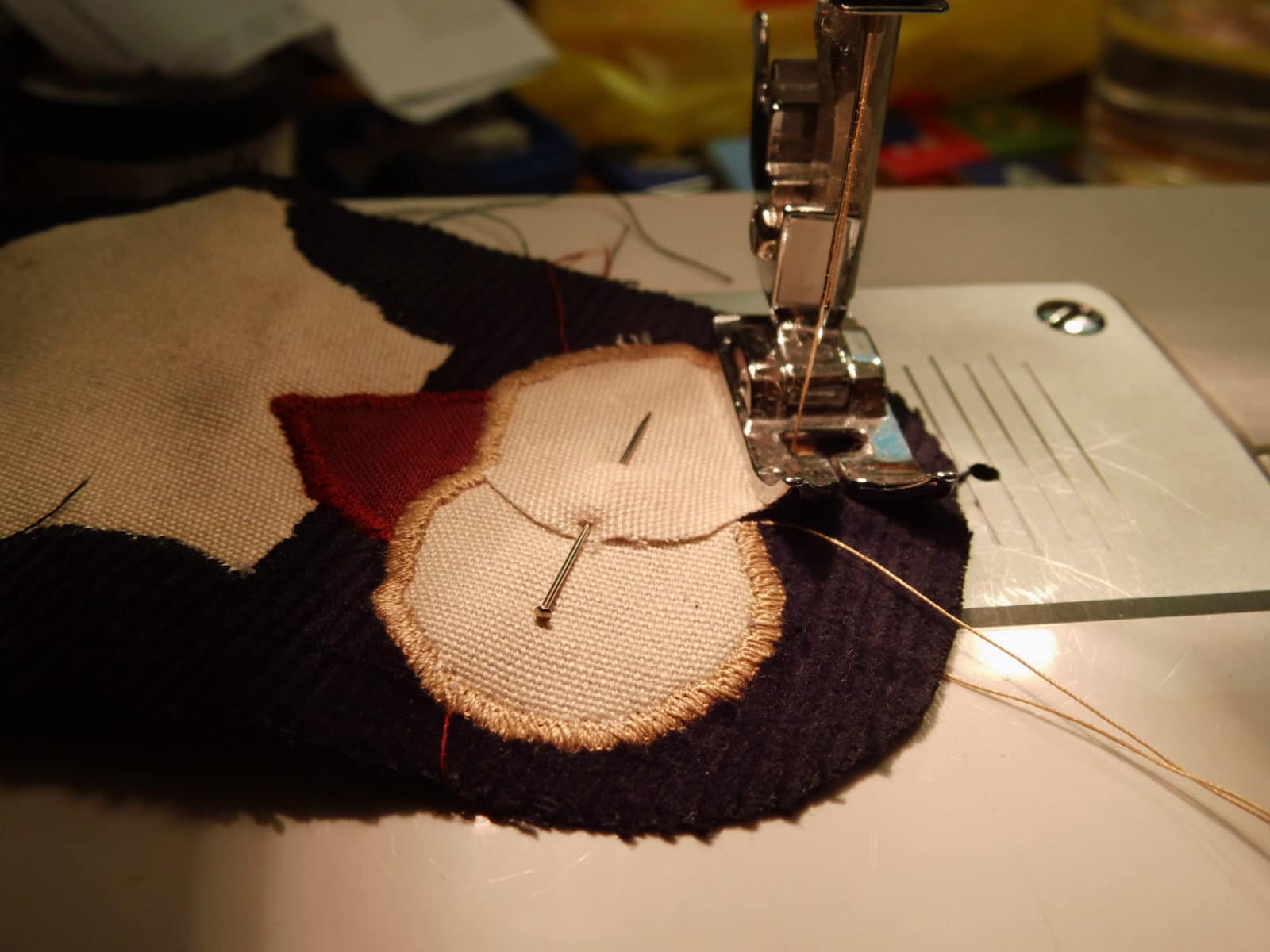 Der Körper wird einmal aus dem Schwarzen Baumwollstoff ausgeschnitten, der Bauch einmal aus dem weißen Baumwollstoff, die Augen zweimal aus dem weißen Baumwollstoff und das Teil für den Schnabel und die Füße aus dem Roten Baumwollstoff. Zunächst wird der Bauch auf den Körper gesteckt und mit weißem Garn und einem mittelbreiten, sehr engen Zickzackstich umrandet und auf diese Weise befestigt. Danach folgt der Schnabel, der mit einem roten Garn angenäht wird und dann die Augen, welche mit einem weißen Garn angebracht werden.