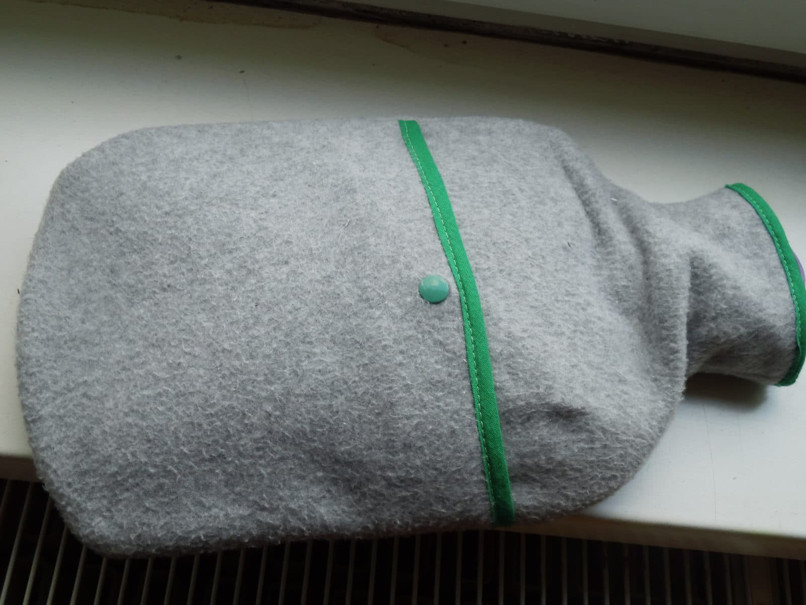 Das Schrägband entlang der unteren Kante des oberen Teils der Rückseite der Wärmflasche anbringen. Oberes Teil auf das untere Teil legen, sodass beide Teile so groß sind wie das Vorderteil der Wärmflasche (sie Markierung auf dem Schnittmuster). Am Rand zusammensteppen. Druckknopf anbringen. Vorderteil und Hinterteil Rechts auf Rechts aufeinanderlegen und einmal rumsteppen. Oben offenlassen. Wenden.