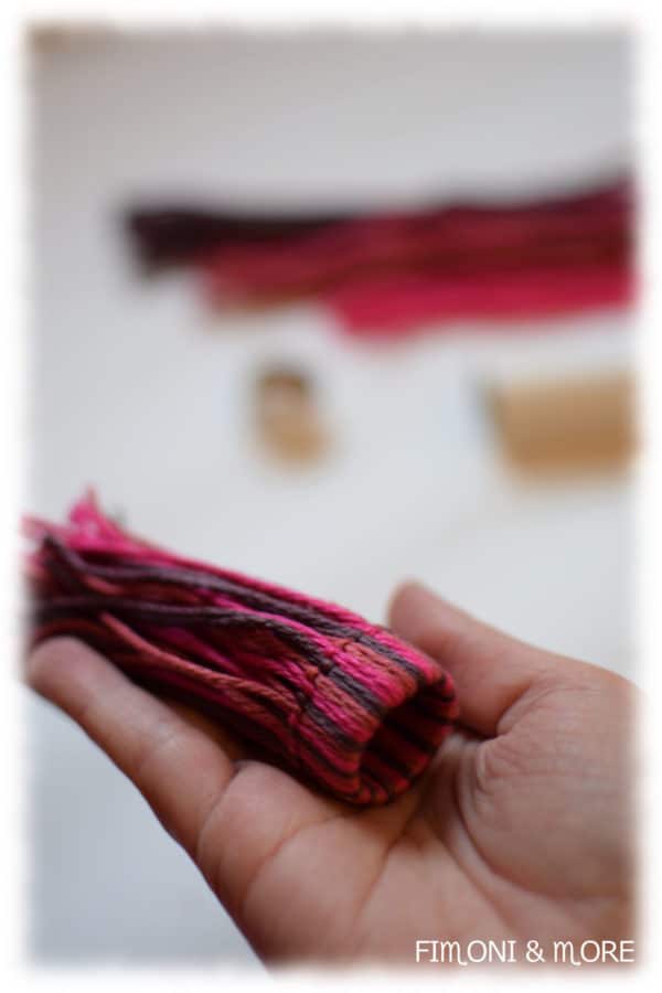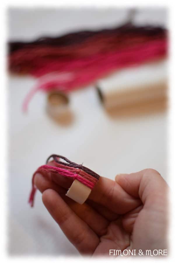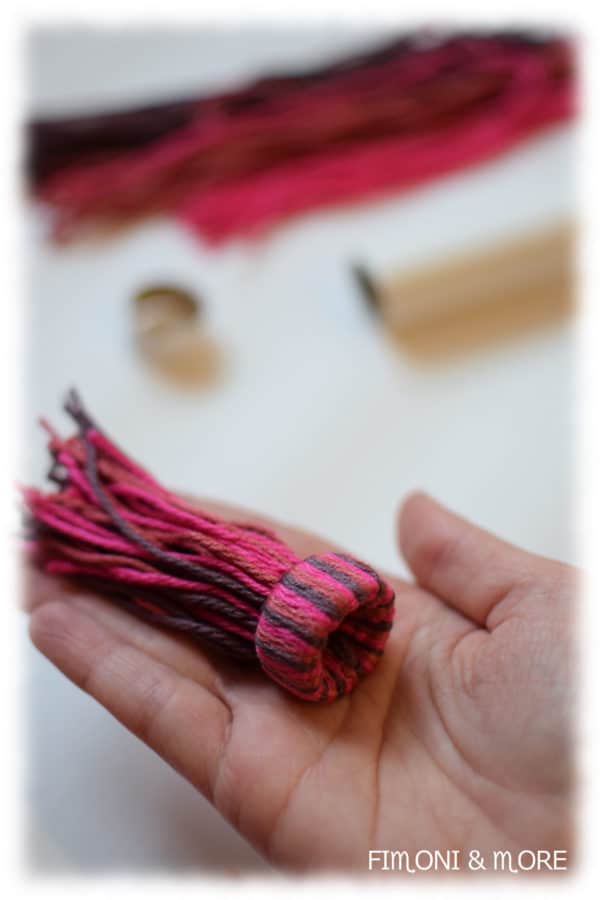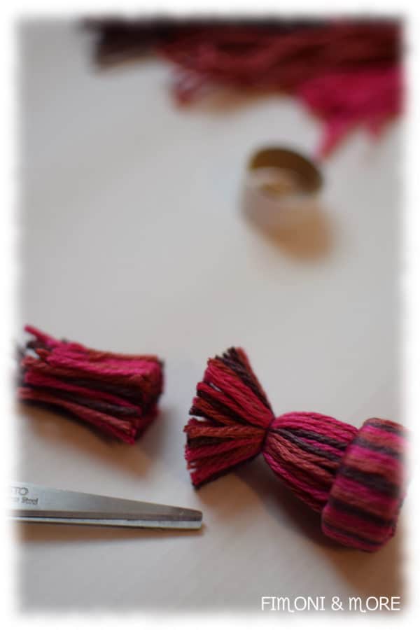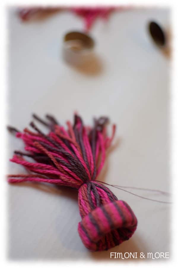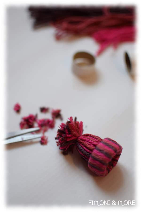 Ich habe für meine Wollmützen die leere Papierrolle einer Geschenkfolie mit etwa 3cm Durchmesser genommen. Dazu Wolle mit einer Nadelstärke 3,5-4. Verwendet man leere Klorollen, so werden die Mützen größer, dauern aber länger, daher dann am besten dickere Wolle verwenden. Die Papierrolle schneide ich in Ringe mit ca. 1,5cm Breite, die Wollstreifen haben eine Länge von ca. 20cm. Nun den Wollfaden halbieren, mit der Lasche durch den Papierring gehen und die Enden dann durch die Lasche festziehen, dies nun mit den anderen Wollfäden wiederholen bis der gesamte Papierring abgedeckt ist. Bei mir waren das etwa 40 Wollfäden. Die Fäden nochmal gut festziehen und dann durch den Ring stülpen, so entsteht eine schöne Krempe. Mit einem Faden nun die Wollfäden zusammenziehen und verknoten. Hier kann man entweder die Wolle verwenden, ich habe farblich passendes Garn genommen, da so fester gezogen werden kann und der Bommel schöner wird. Mit der Schere nun noch die Fäden gleichmäßig abscheiden, die äußeren Fäden dabei anschließend etwas kürzen damit der Bommel runder wirkt. Mit Hilfe des Nylonsfaden können die Mini-Mützen aufgehangen werden.