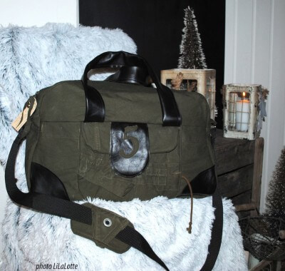 Weekender nach dem Holidaybag Schnitt von lillesol & pelle. Das Material stammt aus alten Militärzelten. Für die Applikationen habe ich Echtes Leder verwendet.