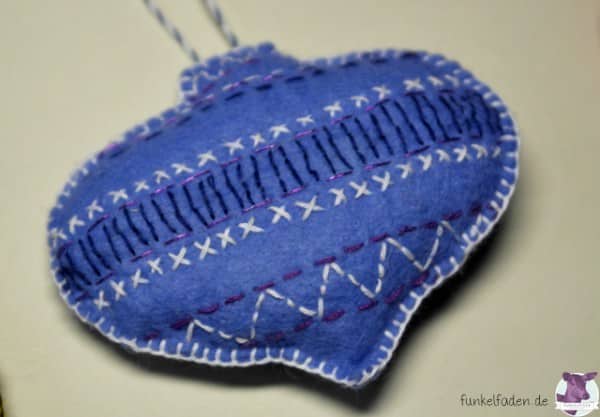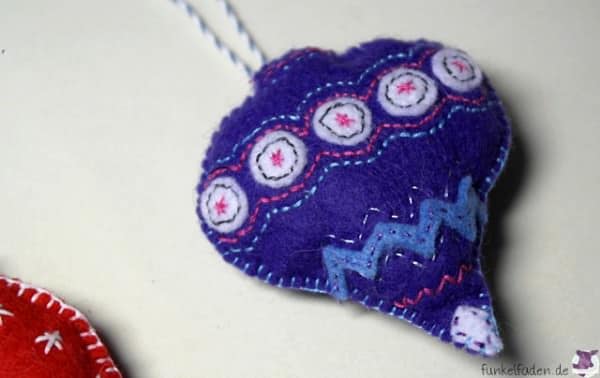 Für diese weihnachtlichen Filzanhänger benötigt man ein wenig Geduld, denn sie werden komplett mit der Hand genäht und das Besticken kostet ebenfalls Zeit. Aber die Mühe lohnt sich auf jeden Fall :)