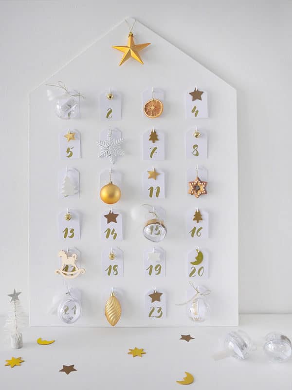Das ist das Haus von Nikolaus und neben an vom Weihnachtsmann… Es weihnachtet sehr… na ja, noch nicht ganz, aber ich bin schon mal bereit dafür! Das ist ein Weihnachtshaus-Adventskalender, das man nicht nur einmal verwenden kann, sondern auch in den nächsten Jahren – ein „Gerüst“ und immens viele Möglichkeiten, es zu dekorieren. Praktisch, oder? Man kann entweder auf der Rückseite der Etiketten eine kleine Botschaft schreiben (z. B. etwas, was man zusammen an dem Tag unternehmen kann) oder auch einen Gutschein aufhängen, dann ist das ein Adventskalender ohne „tastbare“ Geschenke, oder aber auch kleine Tüten mit Süßigkeiten oder Kleinigkeiten hinter den Etiketten aufgehängen.