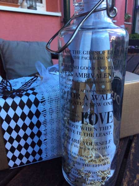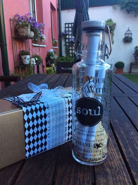 … und natürlich in angemessener Verpackung. Diesmal war es zu einer Hochzeit. Ich wollte dem Brautpaar nicht nur das Taschengeld für die Reise schenken, sondern ihnen auch viele nette Worte schreiben und ihnen so meine Gefühle übermitteln. So schrieb ich alles auf Papier, machte eine Rolle daraus, umwickelte diese mit einem schönen Band und steckte die Glückwünsche in eine Soul-Flasche aus Glas. Diese wiederum legte ich ihn eine schöne Schachtel, um die eine selbstgestaltete Banderole aus Papier geklebt wurde. Und fertig war die Glückwunschgeldgeschenkverpackung! ;)