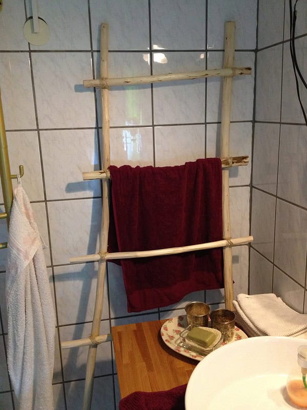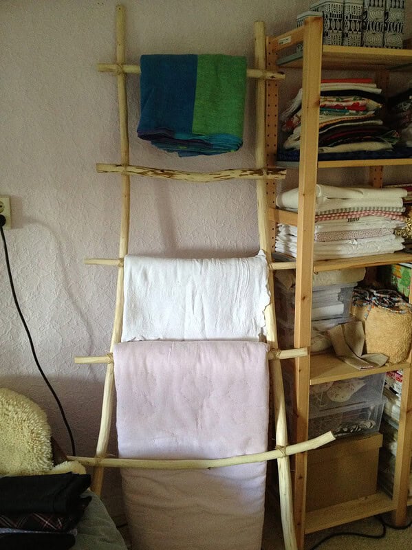 Hier ist eine fertige Leiter in unserem Bad zu sehen. Vorher stand dort ein Plastiktrockner, wo ich morgens nach dem Duschen mein Haarhandtuch drüber hängte. Das war weder schön noch stabil. Da hier feuchte Handtücher darüber gehängt werden, habe ich es mit Klarlack getrichen, ganz dünn, aber sonst wird das Holz auf Dauer grau. Das Holz sollte bei der Verwendung von Lack wirklich gut getrocknet sein.