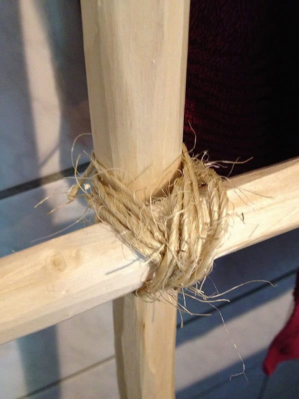 Hier ist zu erkennen, wie ich die Äste miteinander verbunden habe. In den Hauptast habe ich ein Loch gebohrt, da auch mein Kind daran geht und ich es sehr stabil haben wollte. Auf der Höhe wo der Querast hin soll, wird jeweils mit Bleistift eine Markierung gemacht. Dann mit ca. einem 6er Holzbohrer ein Loch mittig gebohrt. Das Wurstkordel wird dann einmal durch das Loch gezogen und um die Äste über Kreuz gewickelt und fest gespannt, dann verknotet. Wer mag nutz nur 5 Queräste, wer mehr Platz brauch zum Aufhängen, der macht 6 Queräste.