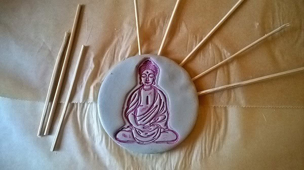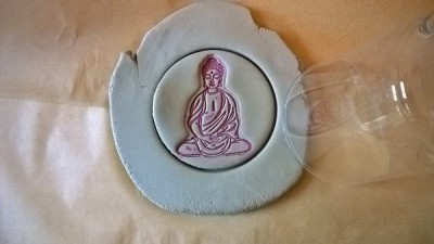 Zuerst die Modelliermasse gut kneten und ausrollen. Nun den Stempel mit Stempelfarbe in die Masse drücken.