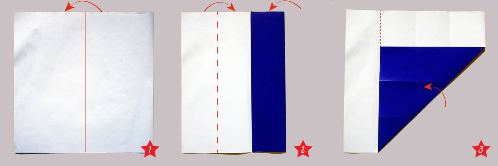 Falte das Papier in der Hälfte und dann jeweils wieder in die Hälfte, so dass 4 Rechtecke entstehen. Falte die rechte untere Ecke nach links, zu äußeren senkrechten Linie.
