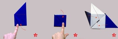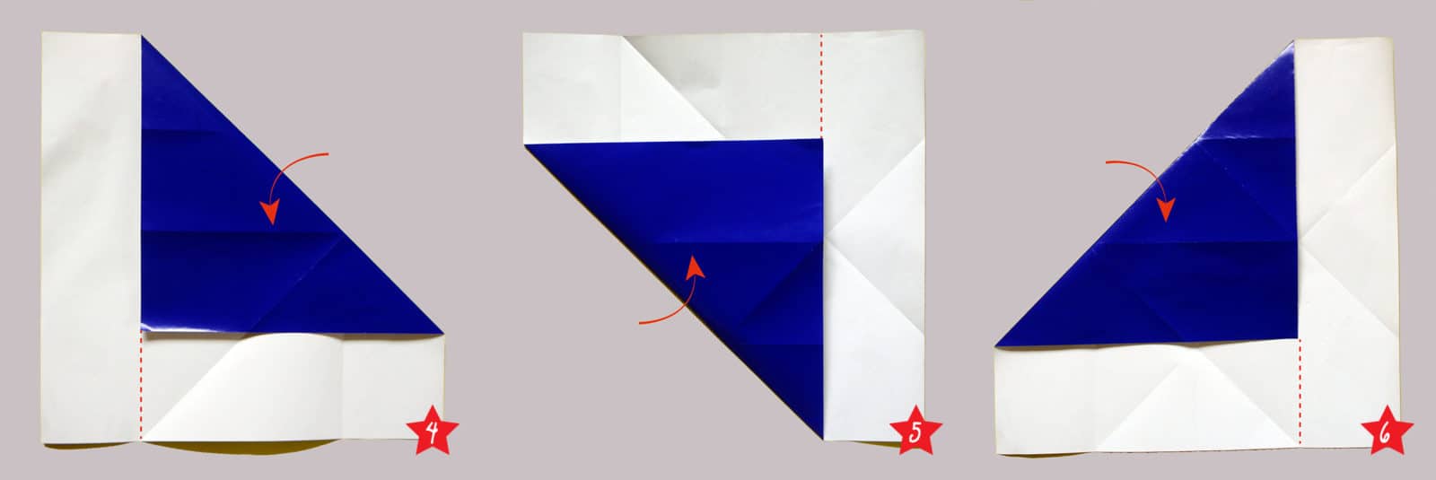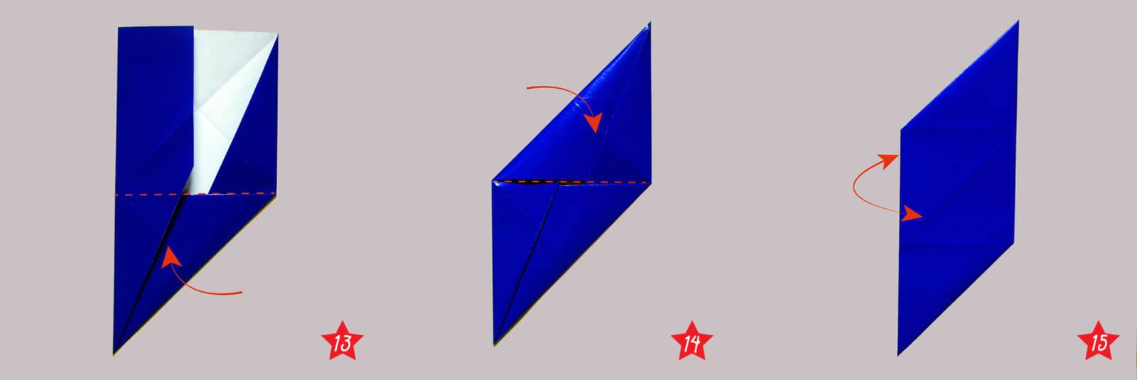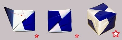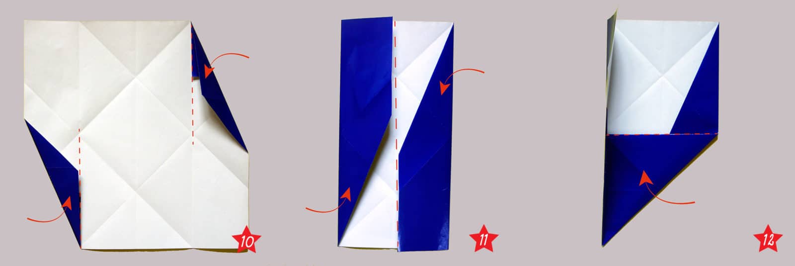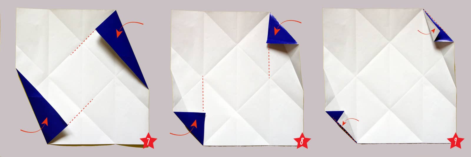 Falte die Ecken wieder nach Innen. Falte auch die Seiten an den äußeren zwei Senkrechten Linien nach innen. Schließlich wird die untere Ecke unter die linke Seite geklappt.