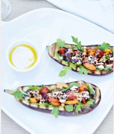 Zwei in Einem: Die gegrillte Aubergine, gefüllt mit einem leckeren Salat mit Schafskäse und Aprikosen von den Foodistas!