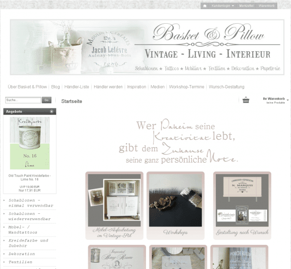 Bei Basket & Pillow bekommst du Möbelschablonen und Möbeltattoos, Kreidefarbe, handgemachte Leinentextilien, Vintage-Mobiliar und Dekoration im nordisch-Französischen Shabby Chic / Landahus-Stil.