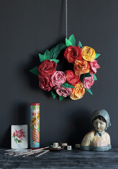 Dieser Rosenkranz entsteht aus Butterbrottüten und Altpapier. Materialien, die normalerweise im Alltag verschwinden, bekommen hier eine neue Form und einen