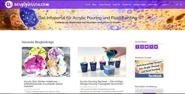 Acrylgiessen.com ist das grösste europäische Informationsportal rund um die Fluid Painting Techniken. Du findest hier Anleitungen für Acrylic Pouring, Resin Kunst und Alcohol Ink.