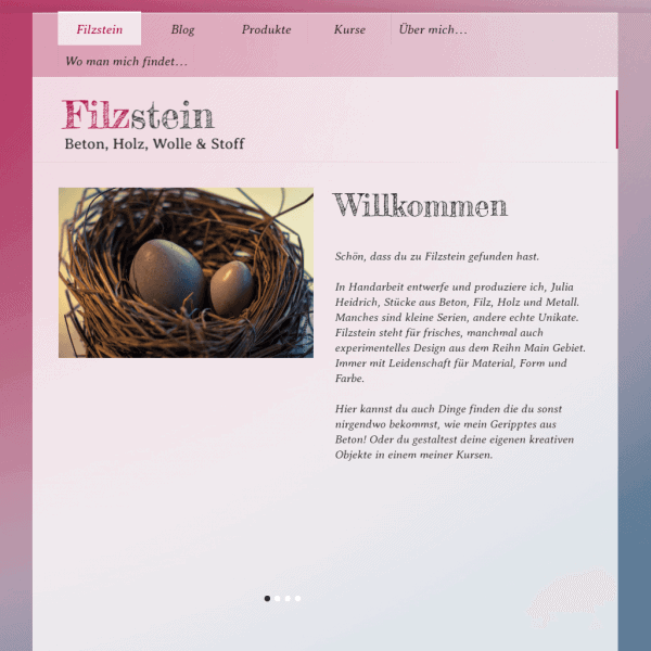 In Handarbeit entwerfe und produziere ich, Julia Heidrich, Stücke aus Beton, Filz, Holz und Metall. Manches sind kleine Serien, andere echte Unikate. Filzstein steht für frisches, manchmal auch experimentelles Design aus dem Reihn Main Gebiet. Immer mit Leidenschaft für Material, Form und Farbe.